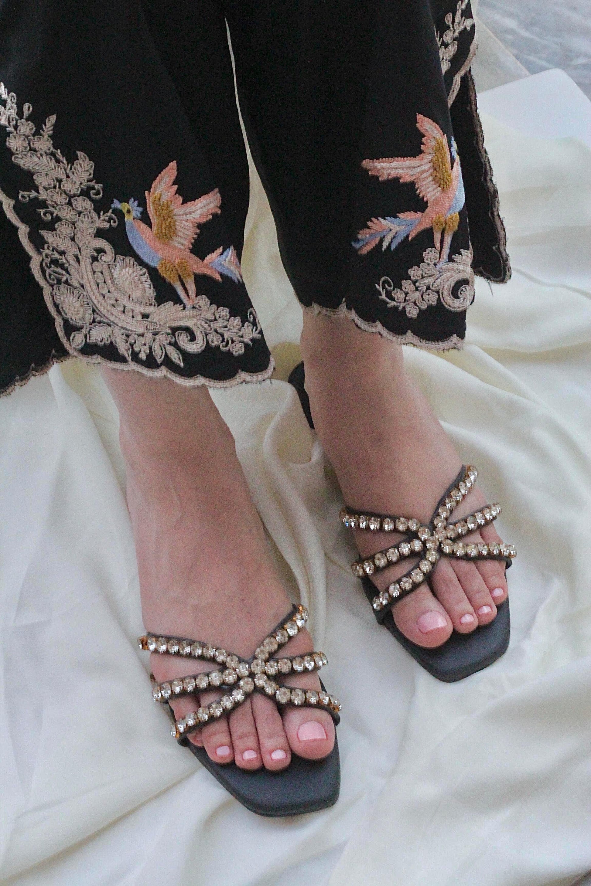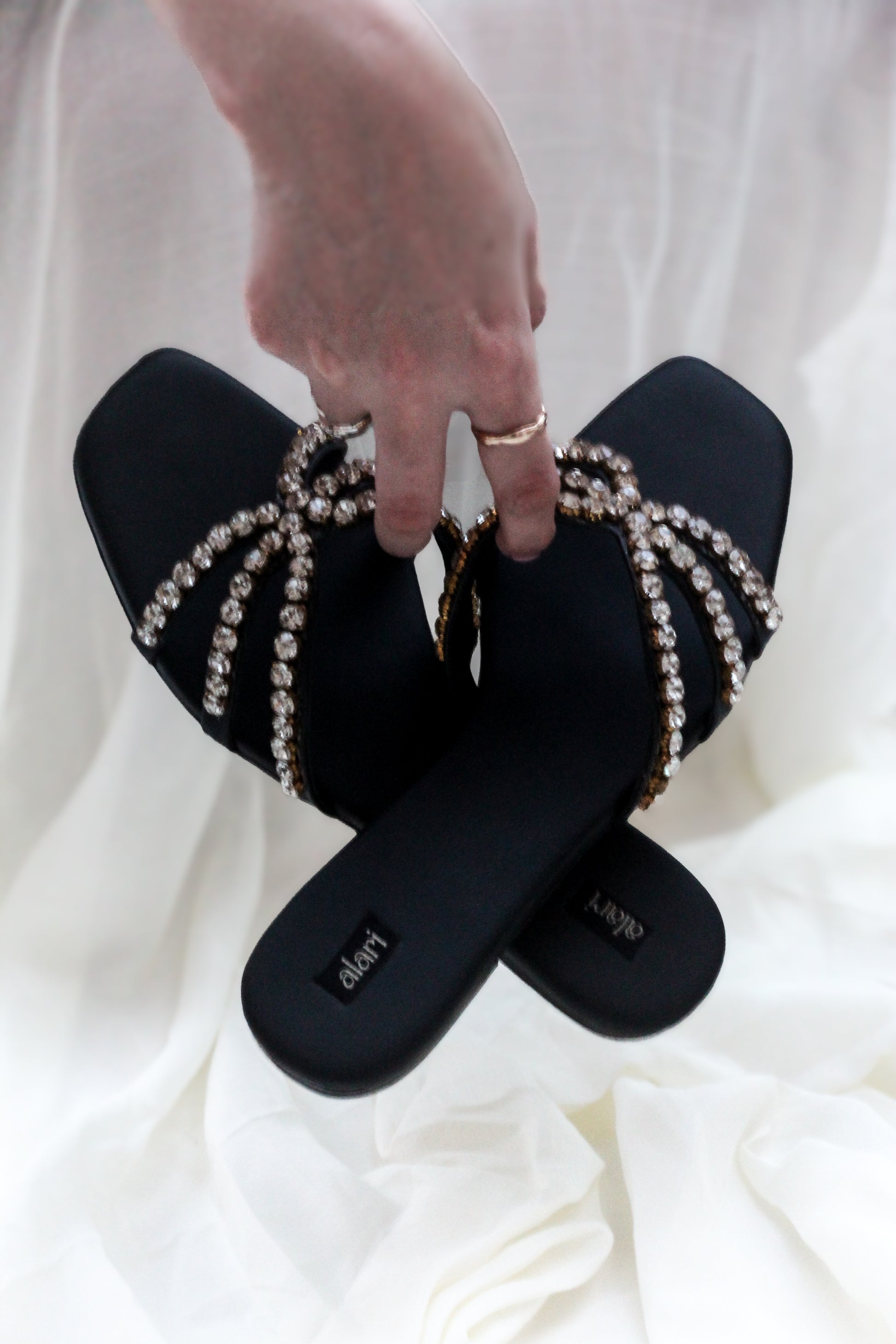 Elevate your style with the 'Amila' black embellished slides, featuring sparkling diamantes that shimmer with every step. Designed for comfort and elegance, these chic slides are perfect for any occasion, making them a must-have addition to your footwear collection.